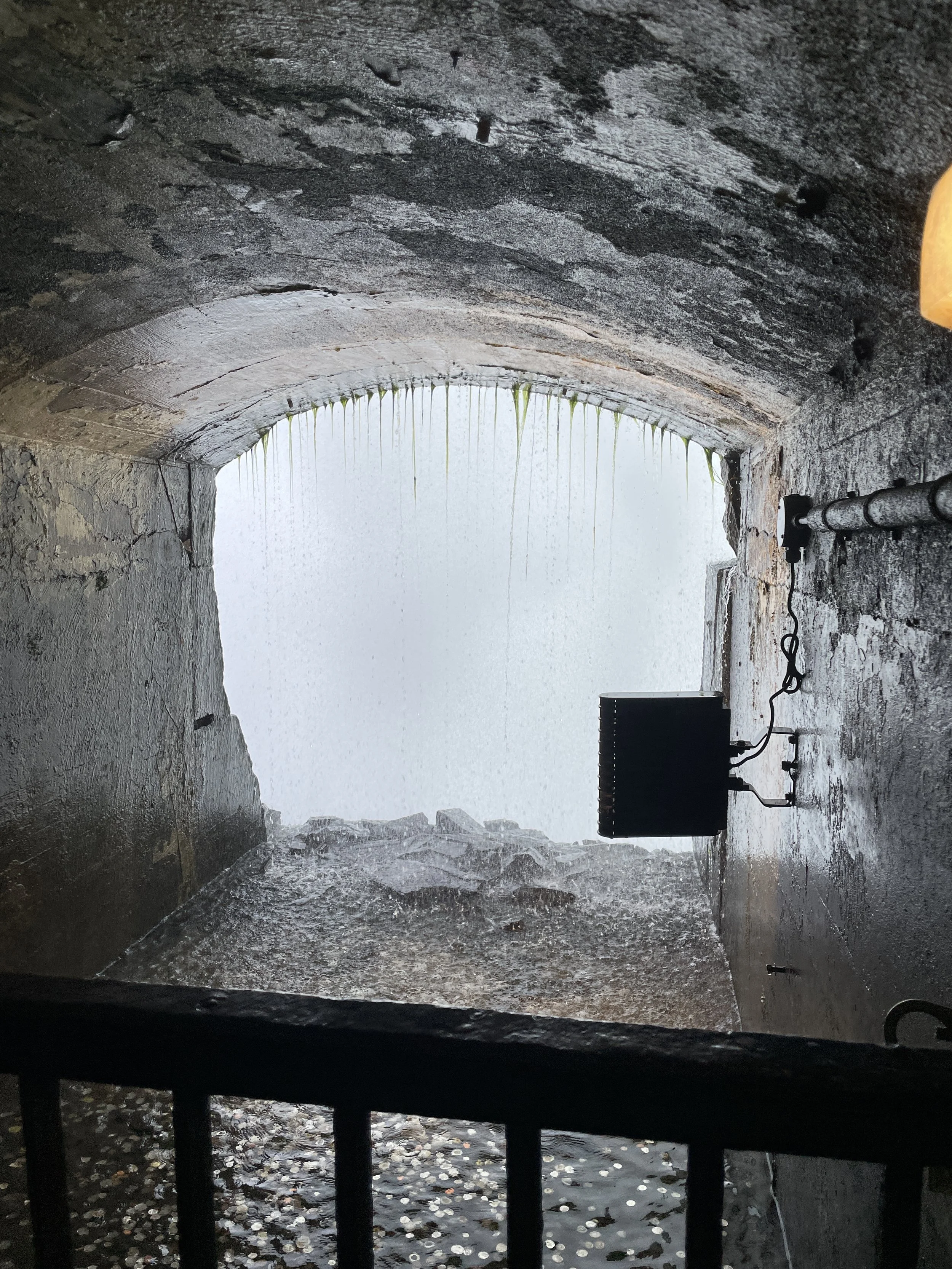 Once we tunnelled down, we found ourselves in a dark, damp hallway. The walls echoed with thrashing water, wet shoes slapping on the floor and strangers’ shrieks of excitement. As we walked along the hall, we discovered that there were multiple mini ports available to stop at, with plaques explaining each the history behind each one. Naturally, the main attraction was the platform where you can step outside and literally be in the middle of the Falls. Surrounded by the aquamarine water pouring over and around us, it is easy to be amazed by the power and vastness of creation.